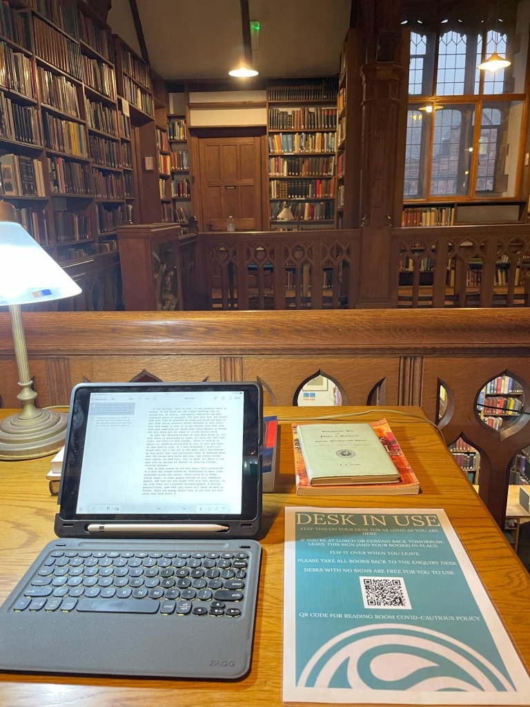 Day 4 was a slow-start day. I only got to the library at 11.30, after breakfast, a bath, and a book. I felt really dehydrated and released that it was probably down to the shift in my diet here – there’s a lot of traditional British fare, which means a LOT of salt. I took the morning slowly, running a bubble bath and reading a novella (I’ll put a list of books read at the end!)