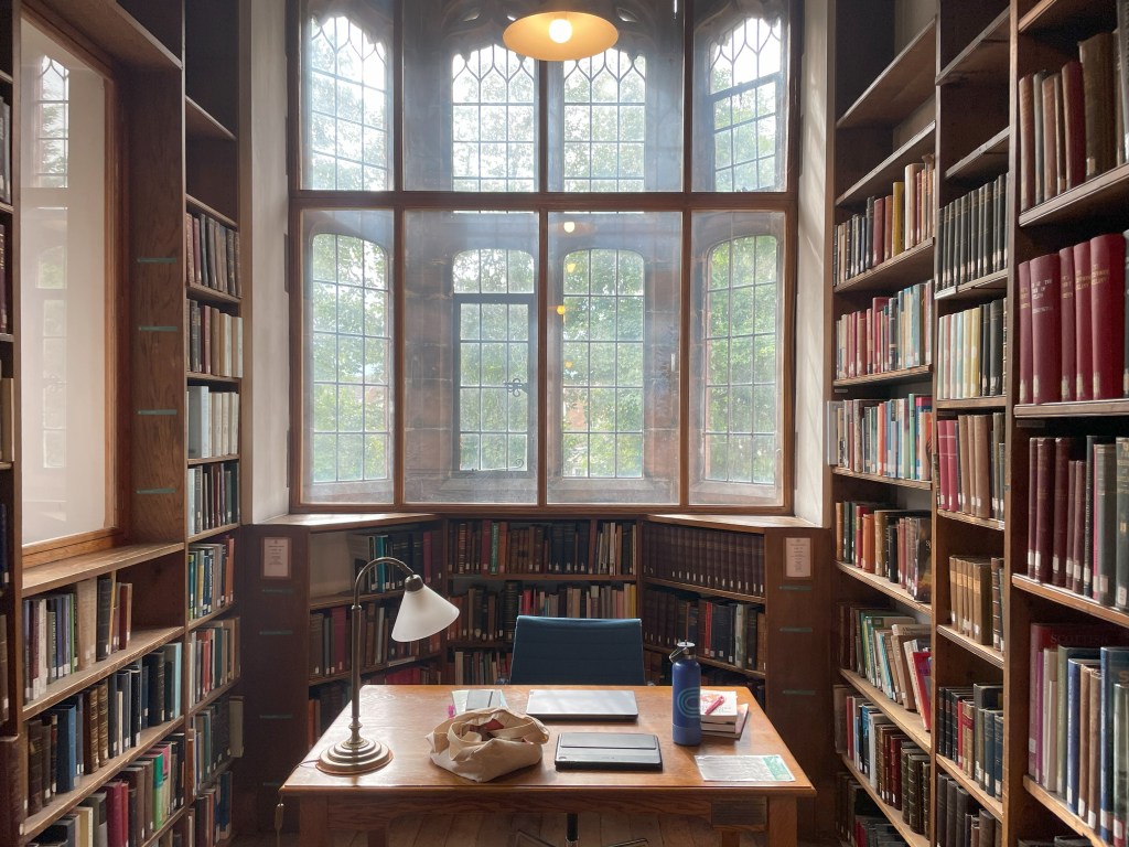 I returned after dinner to find a more permanent desk for the week. It’s first come, first serve, but I was lucky enough to be able to snag this one and mark it as mine with the books I had found on a few topics of interest. It’s a pretty prime spot with good views across the library (And a desk-mate opposite to help with focus; I always find it’s easier to remain in the zone with a buddy, even if they don’t know they’re your buddy…)